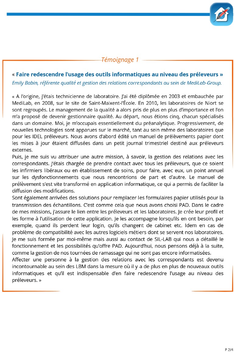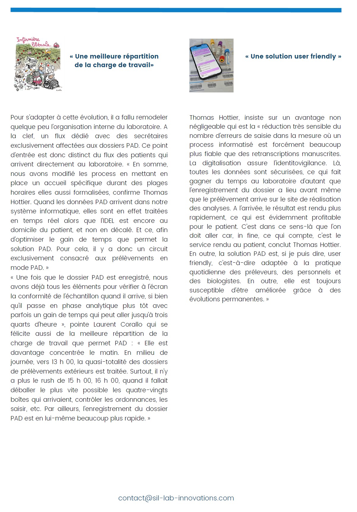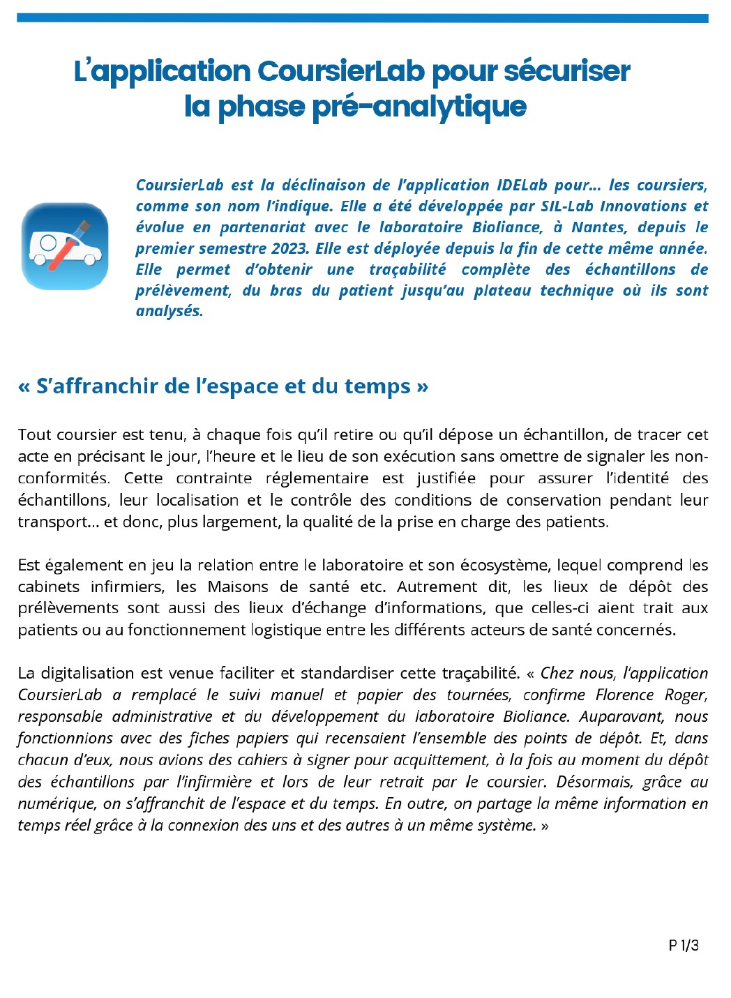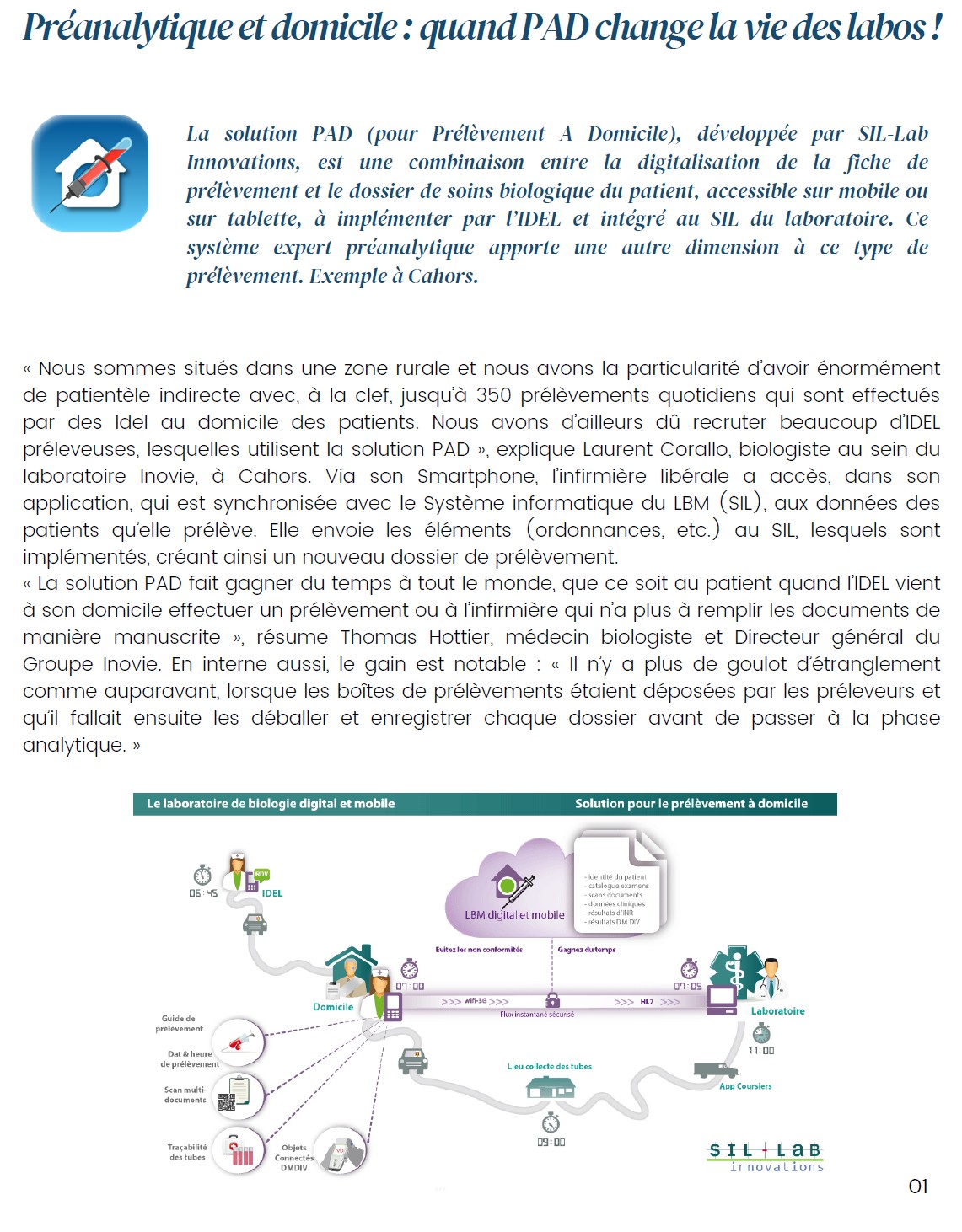 L'informatisation des prélèvements réalisés à l'extérieur du laboratoire est, depuis longtemps, une préoccupation des biologistes. La réforme de la biologie médicale a accentué cet aspect, imposant un suivi tracé de la phase pré-analytique. Des solutions commencent à voir le jour, telles que l'application P-A-D (Prélèvement à Domicile), déployée par la société SIL-LAB Innovations dans les LBM français.