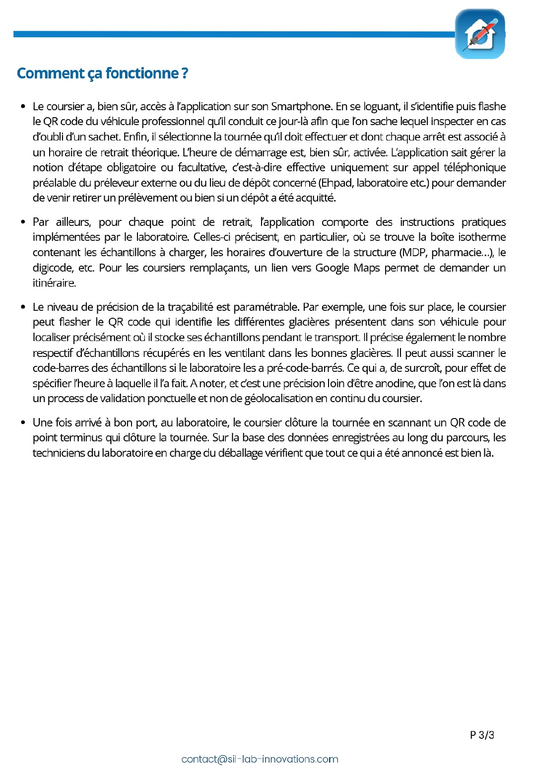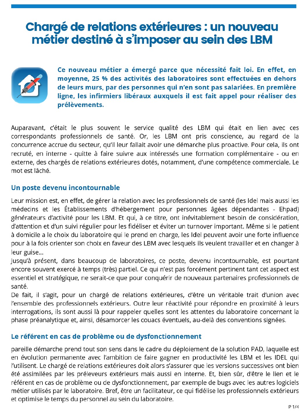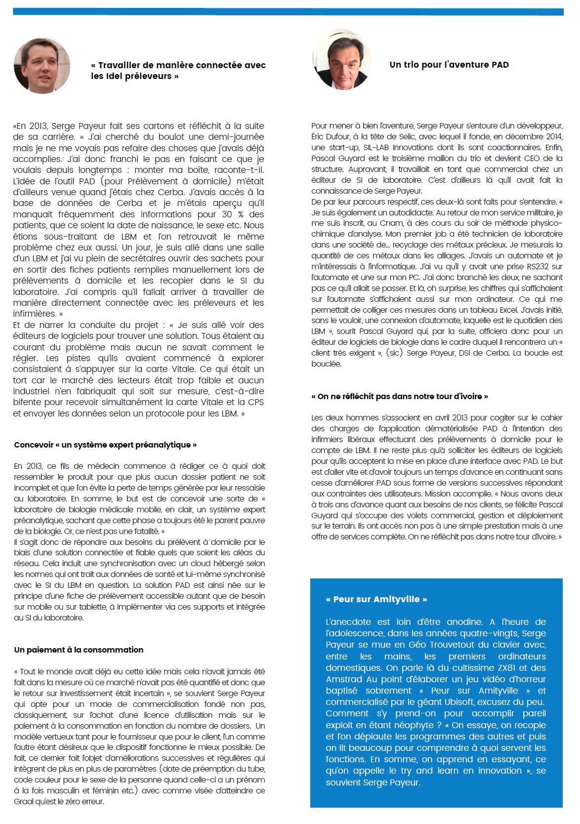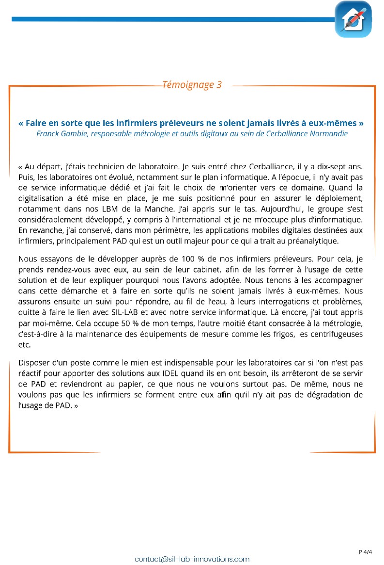 L'informatisation des prélèvements réalisés à l'extérieur du laboratoire est, depuis longtemps, une préoccupation des biologistes. La réforme de la biologie médicale a accentué cet aspect, imposant un suivi tracé de la phase pré-analytique. Des solutions commencent à voir le jour, telles que l'application P-A-D (Prélèvement à Domicile), déployée par la société SIL-LAB Innovations dans les LBM français.