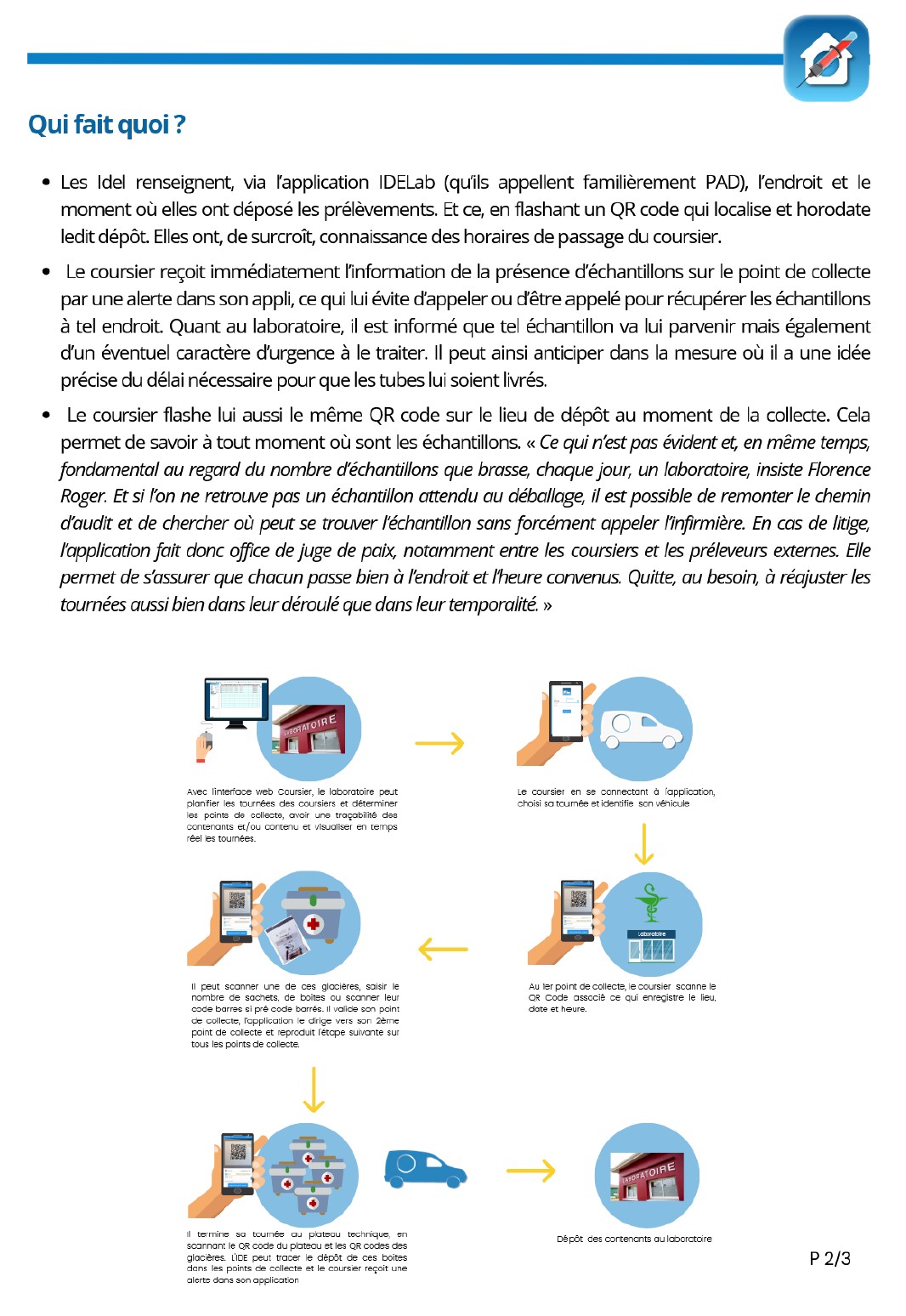 Depuis fin mai 2020, les premières Infirmières Libérales (IDEL) réalisent à domicile en connexion avec le laboratoire de biologie médicale des analyses d'INR pour des patients suivis sous AVK grâce à la plateforme P-A-D ou a ses applications mobiles IDELAB, INOVIE PAD, IDELBI, IDEL'IZ. Il s'agit d'une réelle avancée dans les possibilités de télédiagnostic et de télésuivi des patients qui ont besoin de biologie. Dans cet article 51 d'innovation du parcous de soins, l'Infirmière peut redoser le pillulier du patient après une minute d'analyse sur une seule goutte de sang du patient et avec la même qualité et le même niveau de conseil et d'expertise que si cette analyse était faite au laboratoire de biologie médicale. Le biologiste conserve la responsabilité de cette analyse, de la validation du résultat, d'informer le Médecin et de former l'Infirmière.